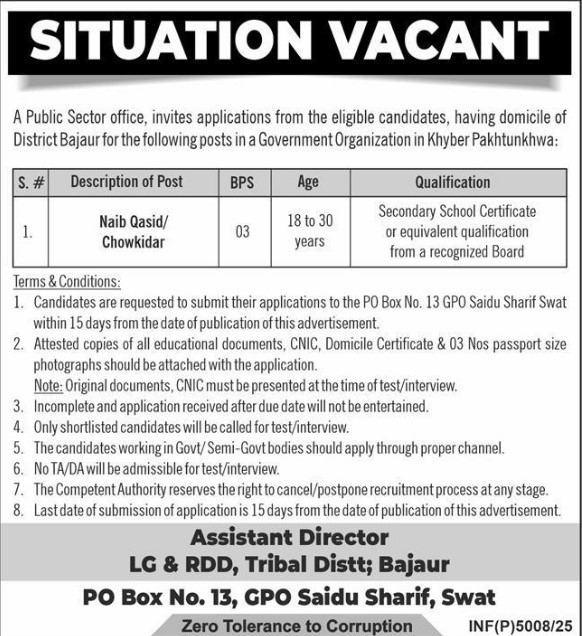 Candidates if you are seeking A Public Sector Office Jobs In Swat December 2025 Apply Online if yes. It would be best if you tried to complete read A Public Sector Office job because you can easily apply for these vacancies Naib Qasid/ Chowkidar.