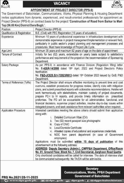 Candidates if you are seeking Communications Works PPH Department Jobs In Balochistan December 2025 if yes. It would be best if you tried to complete readCommunications Works PPH Department job because you can easily apply for these vacancies Project Director (PPS-9)l.