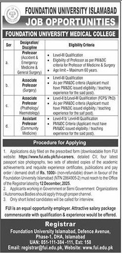 Only male candidates can apply for Founditation University Jobs In Islamabad December 2025 Qualification /Experience Required: Level-l Qualification Elgbility of Professor as per PM&DC criteria for Professor of Medicine & Surgery Age limit- Maximum 60 years. and more experienced candidates should apply before 12 December2025.