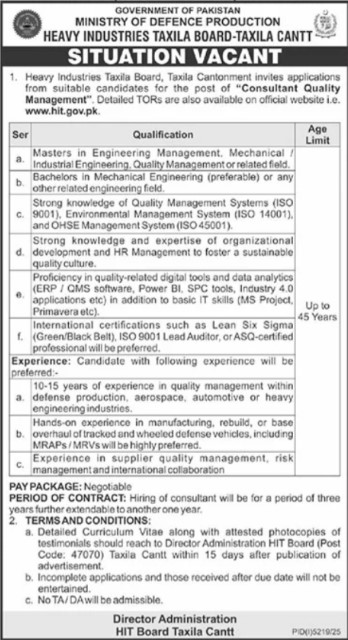 Candidates if you are seeking Heavy Industries Taxila Board Jobs In Taxila Cantt January 2025 if yes. It would be best if you tried to complete read Heavy Industries Taxila Board job because you can easily apply for these vacancies in the Director of Administration. Only male candidates can apply for Heavy Industries Taxila Board Jobs In Taxila Cantt January 2025 Qualification /Experience Required: Master’s in Engineering Management. Mechanical/ Industrial Engineering, Quality Management or related field. Bachelor’s in Mechanical Engineering (preferable) or any other related engineering field, and more experienced candidates should apply before 12 January 2026.