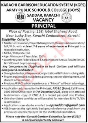 Only male candidates can apply for Karachi Garrison Education System Jobs In Karachi December 2025 Qualification /Experience Required:Masters in Education/Project Management/Business Administration/ MA/M.Sc with at least 7-8 years of experience as Principal in a reputable institution.MPhil/PhD preferred and more experienced candidates should apply before 047 December2025.