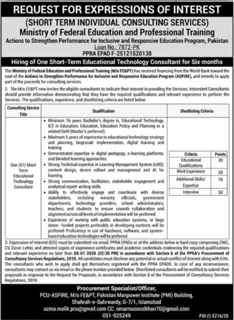 Candidates if you are seeking Ministry Of Federal Education Jobs In Islamabad, January 2025 if yes. It would be best if you tried to complete read Ministry Of Federal Education job because you can easily apply for these vacancies One (01) Short Term Educational Technology Consultant.