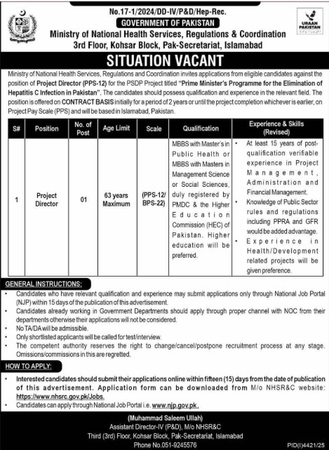 Candidates if you are seeking Ministry Of Health Service And Coordination Jobs In Islamabad 2025 if yes. It would be best if you tried to complete read Health Service And Coordination job because you can easily apply for these vacancies Project Director.