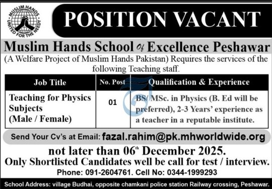 Only male candidates can apply for Muslim Hands School And Excellence Jobs In Peshawar December 2025 Qualification /Experience Required:BS/MSc. in Physics (B. Ed will be preferred), 2-3 Years’ experience as a teacher in a reputable institute, and more experienced candidates should apply before 06 December2025.