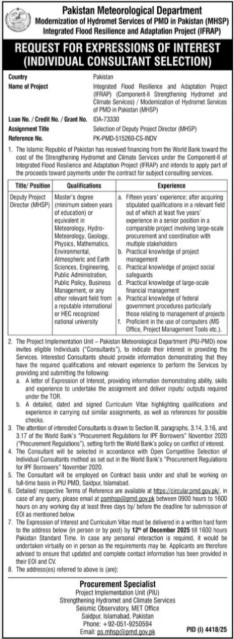 Candidates if you are seeking Pakistan Meteorological Department Jobs In Islamabad December 2025 if yes. It would be best if you tried to complete read Pakistan Meteorological Department job because you can easily apply for these vacancies Deputy Project Director (MHSP), Only male candidates can apply for Pakistan Meteorological Department Jobs In Islamabad December 2025 Qualification /Experience Required: Master’s degree (minimum seventeen years of education) or equivalent in Meteorology, Hydro-Meteorology, or Geology. Physics, Mathematics, Environmental and more experienced candidates should apply before 12 December 2025.