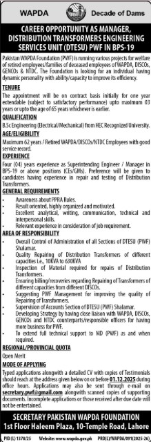 Only male candidates can apply for Pakistan Wapda Foundation Jobs In Lahore December 2025 Qualification /Experience Required:B.Sc Engineering (Electrical/Mechanical) from HEC Recognized University. AGE/ELIGIBILITY Maximum 62 years/Retired WAPDA/DISCOS/NTDC Employees with good service record , and more experienced candidates should apply before 01 December 2025.