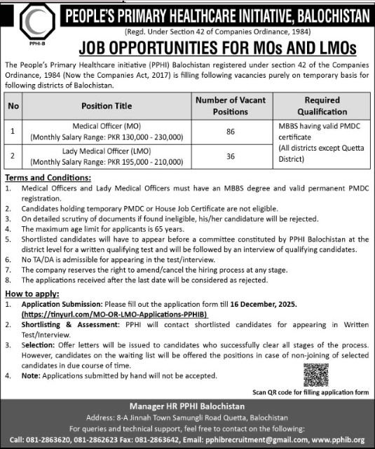 Only male candidates can apply for Peoples Primary Healthcare Initiative Jobs In Balochistan December 2025 Qualification /Experience Required: MBBS having valid PMDC certificate (All districts except Quetta District) candidate may apply and such degree shall not be issued later than three (3) years from the date of advertisement Fresh Graduates from reputable universities are encouraged to apply, and more experienced candidates should apply before 16 December2025.