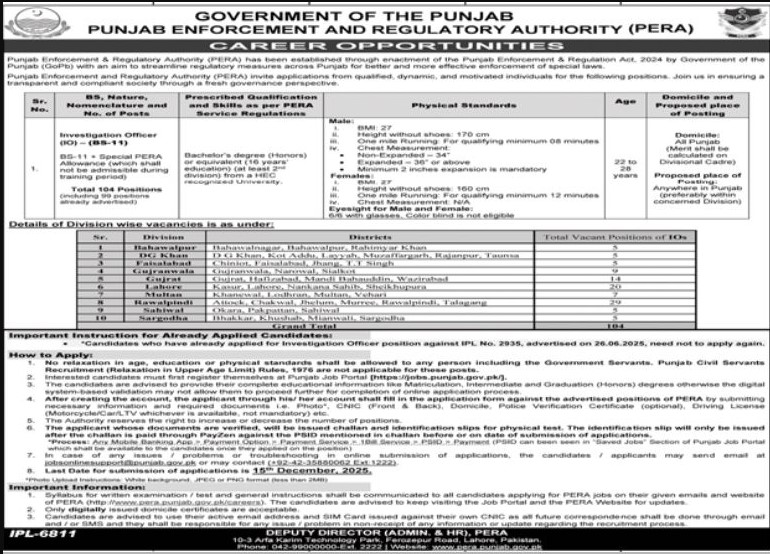 Only male candidates can apply for Punjab Enforcement And Regulatory Authority Jobs In Lahore 2025 Qualification /Experience Required: Bachelor’s degree (Honors) or equivalent (10 years education) (at least 2 division) from a HEC recognized University, and more experienced candidates should apply before 15 December 2025.