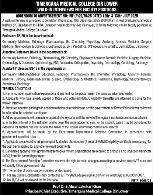 Only male candidates can apply for Timergara Medical College Dir Lower Jobs In Karachi December 2025 Qualification /Experience Required:Name, number, qualification/experience and age limit for the posts remain the same as advertised earlier Applicants who have already applied or those who obtained PM&DC eligibility thereafter are informed to come for this walk-in interview. Attractive incentive packages in addition to their regular salaries as per the government of Khyber Pakhunkhwa policy will be offered to the selected candidates.and more experienced candidates should apply before 10 December 2025.